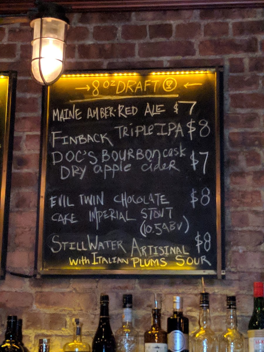 The menu at The Crown Inn features a variety of beverages, with a strong emphasis on craft beers, cocktails, and seasonal drinks. Visitors can find a selection of draft beers including options like Maine Amber Red Ale, Finback Triple IPA, and Evil Twin Chocolate Cake Imperial Stout, priced between $7.00 and $8.00. The assortment also includes unique ciders such as Docs Bourbon Cask Dry Apple Cider and Still Water Artisanal With Italian Plums Sour.